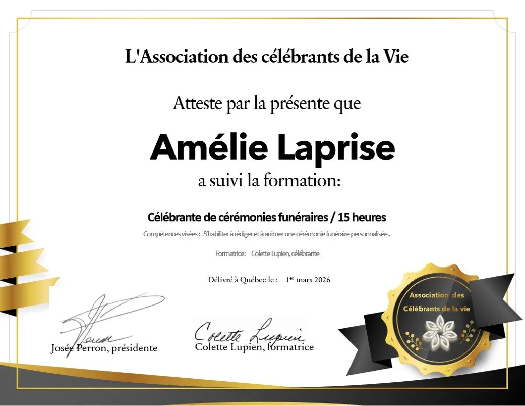 La spiritualité occupe une grande place dans ma vie. Elle s’exprime sous forme de poésie, à travers l’art ou simplement au quotidien. Je crois en l’importance du rituel, notamment dans un processus de deuil. C’est pourquoi j’ai choisi de mettre ma sensibilité artistique au service de la dignité humaine en devenant célébrante funéraire. Chacun, chacune mérite que son passage sur cette Terre soit souligné au moment de la mort. Si vous souhaitez un hommage personnalisé, inspiré de la beauté des choses simples de la vie, je suis là pour vous.